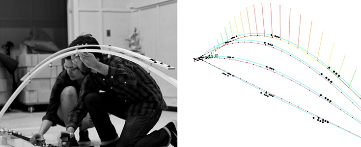 Students will be asked to engage in physical prototyping and testing through both manual and digital fabrication; an essential process in understanding material properties that will ultimately inform on-screen design and production. We’ll begin by building physical models without the aid of the computer in order to gain a working knowledge and expectation for how the material will react under stress. To follow, the class engages in a skill-building process that attempts to develop accurate digital simulations of material behavior which is compared to the digitally measured physical models. This attempt at calibration conceptually bridges digital and physical form-finding, while adding material specificity to otherwise abstract numeric values required to run the simulation. The methods for digital measurement are dependent on the scale of the material and desired precision; the course will experiment with a MicroScribe digitizer for small scale models, accelerometers (motion sensors) for larger scale prototypes, and the SMART COE’s Vicon Motion Capture System in the newly constructed Bonner Hall Sandbox for more accurate, full scale measuring and calibration.