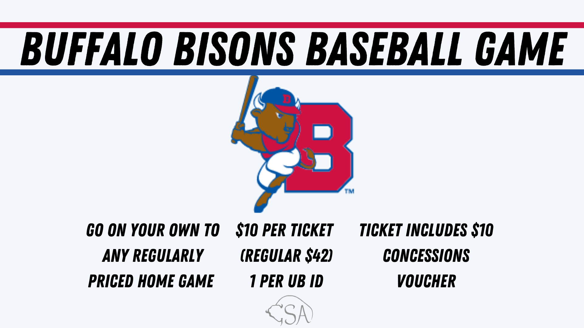 GSA will have flex passes for Buffalo Bisons Baseball Games on sale for $10 each starting on April 13th at the UB Ticket Office (online or in 221 Student Union).  1 per UB ID.  Limited quantity available. First come, first served.