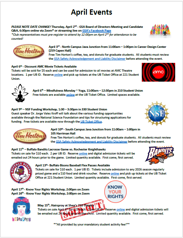 As we usher in a new semester, we would like to remind everyone that you pay for resources, and you have the right to voice your experiences and make requests of those offices. You also have the right to reach out to government representatives at all levels to make your voices heard on federal policies that are impacting students throughout the state, the country, and around the world. Please do not take that for granted. Additionally, the GSA has an international student committee and we invite students to contact us if they are interested in getting their concerns elevated to upper administrative bodies on campus.