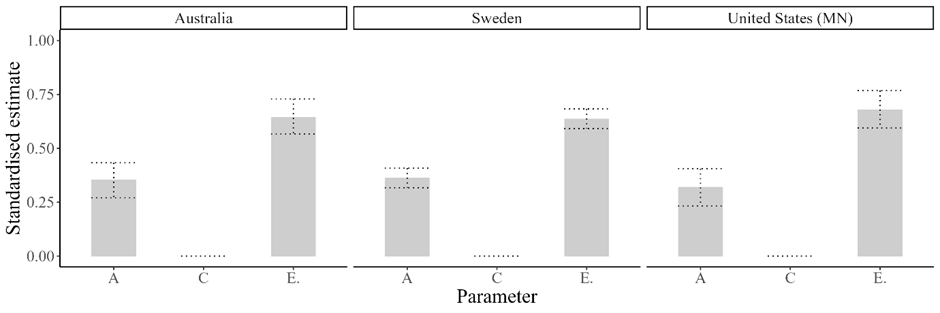 In our paper, therefore, we take a different approach. We use data from four twin studies (two in the US, one in Sweden, and one in Australia). We know that twins share a substantial proportion of their early environment and inherited traits, even if we have not measured these factors directly. This means we can use known correlations in early environments and inherited traits in (identical and non-identical) twin pairs to estimate their contributions to political trust.